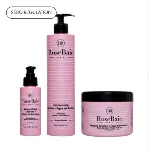 Rééquilibrez votre cuir chevelu avec la routine Figue de Barbarie Rosebaie : une cure idéale pour espacer les lavages tout en hydratant les longueurs sèches.